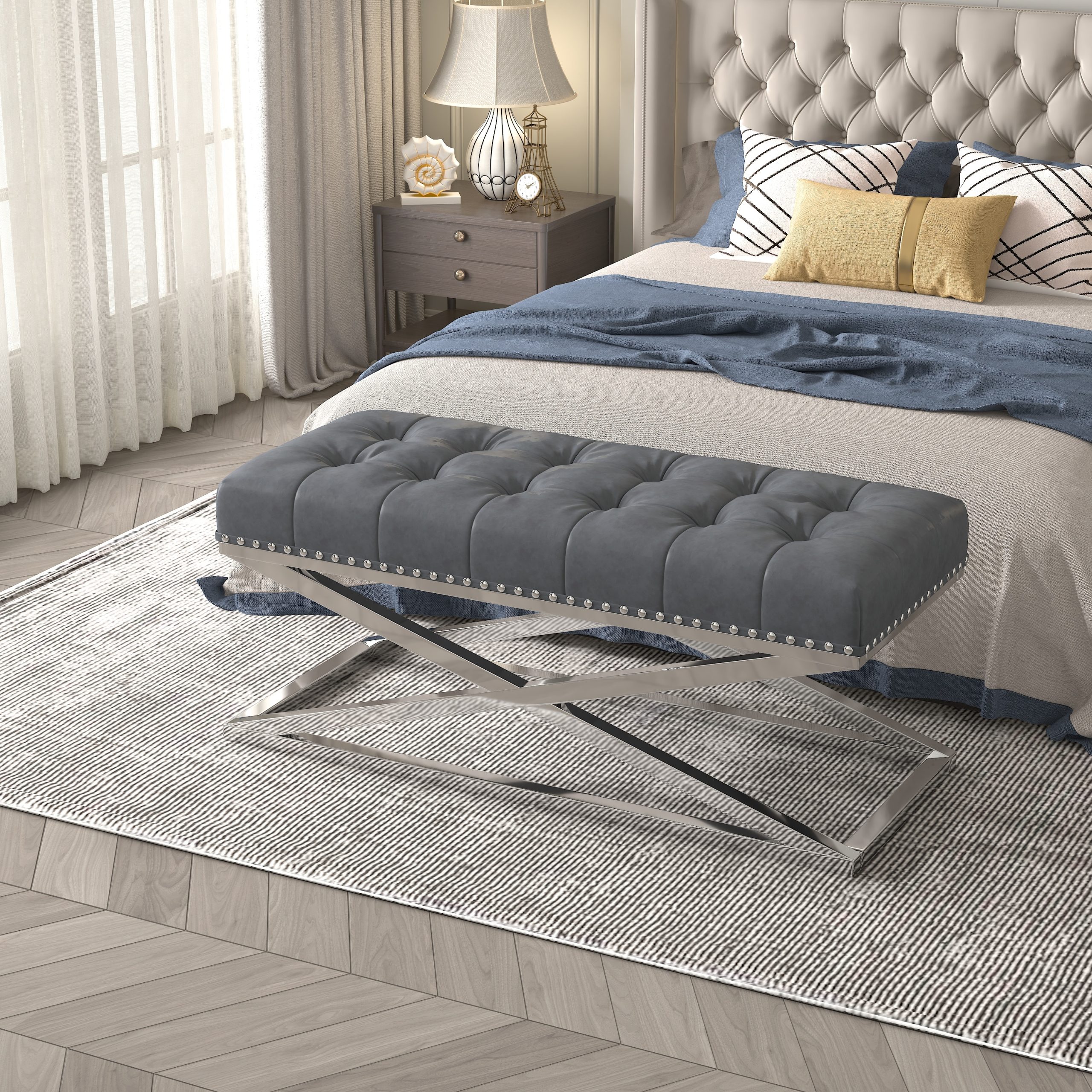 MATERIAL SELECT: Shiny stainless steel frame with vintage faux leather upholstery,and the tufted surface, this bench looks so stylish.